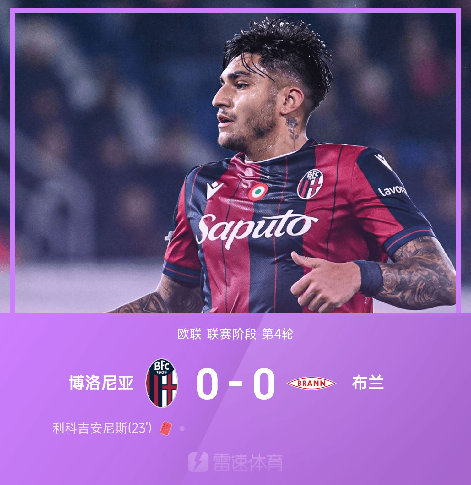 6686體育11月07日訊 25/26賽季歐聯聯賽事階段第4輪,波隆那坐鎮主隊場對上布蘭。上半場競賽利科吉安尼斯染紅。全場競賽,兩隊合計僅3次打門命中門框範圍,競賽也十分沉悶。最終,十人戰鬥的波隆那在主隊場0-0悶平布蘭。