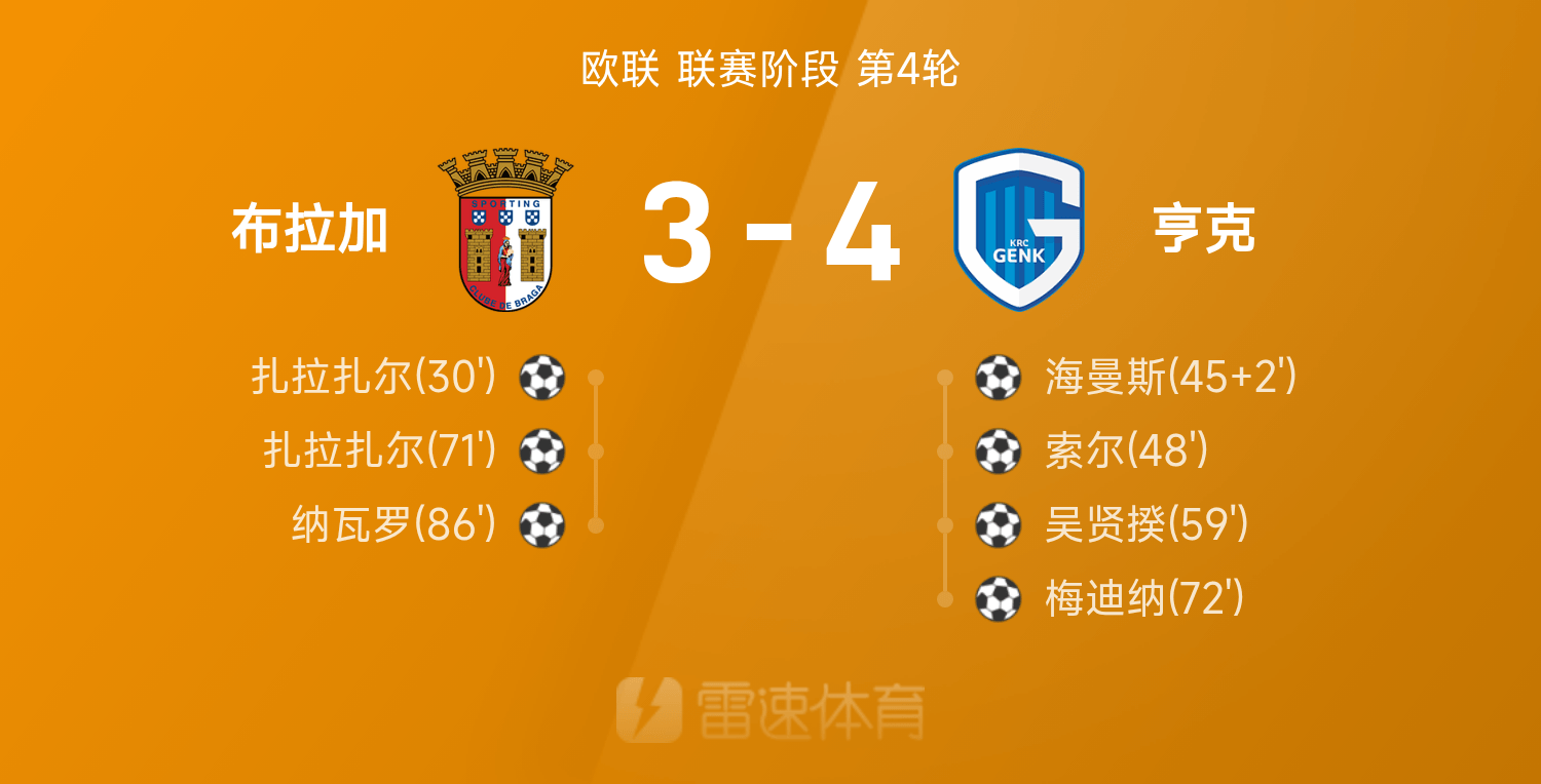 歐聯戰報:海曼斯1射1傳,札拉札爾雙響,亨克4-3布拉加