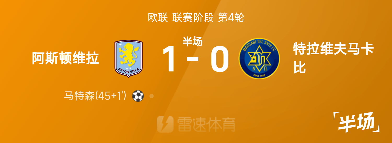 歐聯半場:馬特森破門,馬丁獻神撲,維拉1-0特拉維夫馬卡比