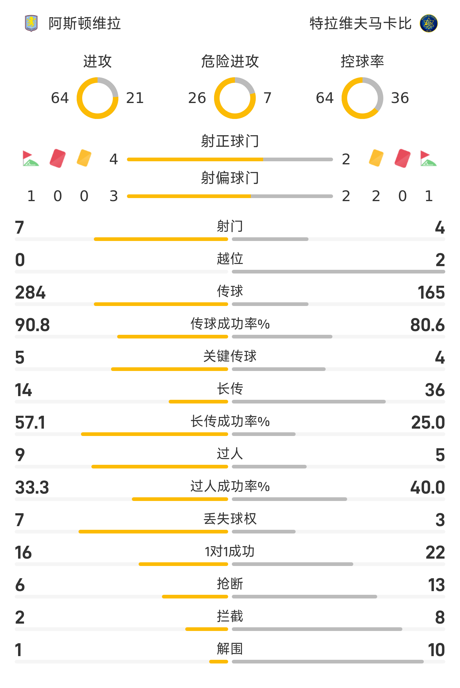 阿斯頓維拉先發陣容:23-馬丁內斯、3-林德洛夫、4-孔薩、14-托雷斯、22-馬特森、19-桑喬、24-奧納納、29-蓋桑、27-羅傑斯、2 6-博加德、17-馬倫
