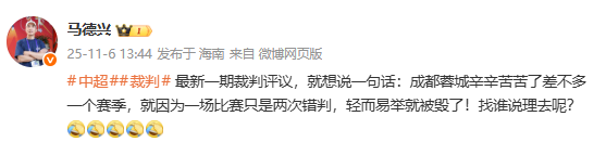 6686體育11月6日訊 體壇記者馬德興在社媒上表示,成都蓉城一個賽季讓兩個誤判毀了。