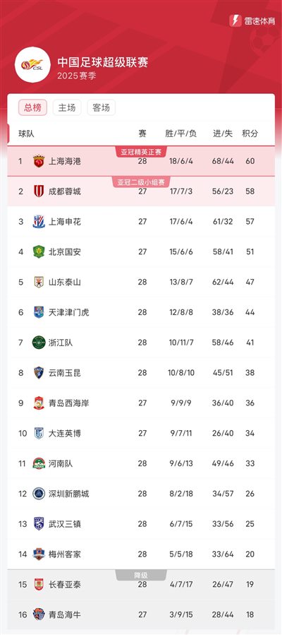 海港終結聯賽事四連勝,最新的積分榜中,球隊仍列榜首,但僅領跑位蓉城2分,蓉城今晚若戰勝青島西海岸,則升至榜首;申花今晚對陣大連英博,球隊積57分暫列第三。