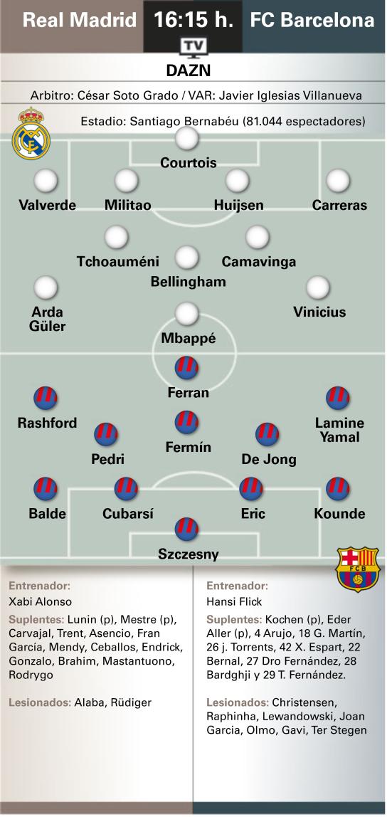 6686體育10月26日訊 北京時間今晚23點15分,西甲國家德比將在伯納烏上演。皇家馬德里主隊場迎戰巴塞隆納,這不僅是賽季首回合“國家德比”,更是一場爭奪榜首的直接對話——如果取勝,巴薩將逆轉局皇馬登頂積分榜。賽前,《世界體育報》對兩隊先發進行了預測。