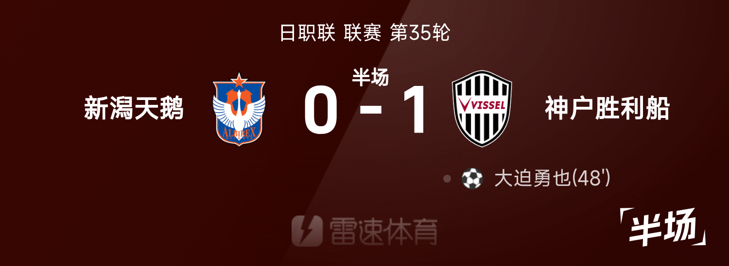 日職聯盟半場:大迫勇也補時破門,新潟天鵝暫0-1神戶勝出局船