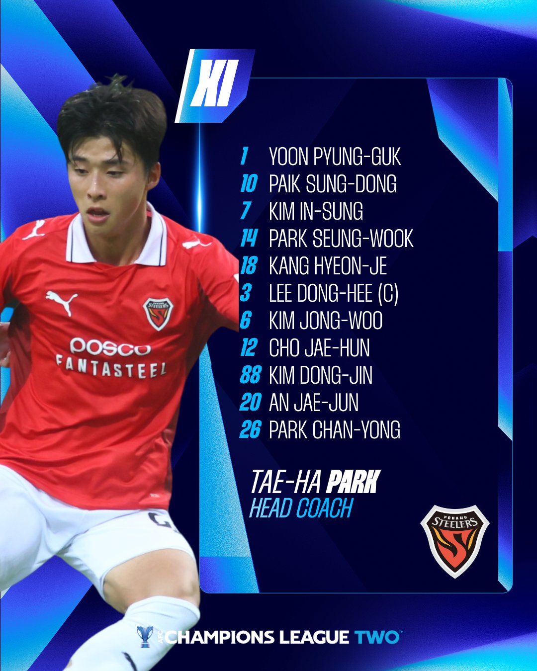 浦項鐵人首發:1-尹平國、7-金仁成、10-白星東、14-樸乘煜、6-金鍾佑、3-李東熙、12-趙在勳、18-姜現題、26-佑、20-安在東、88886-p