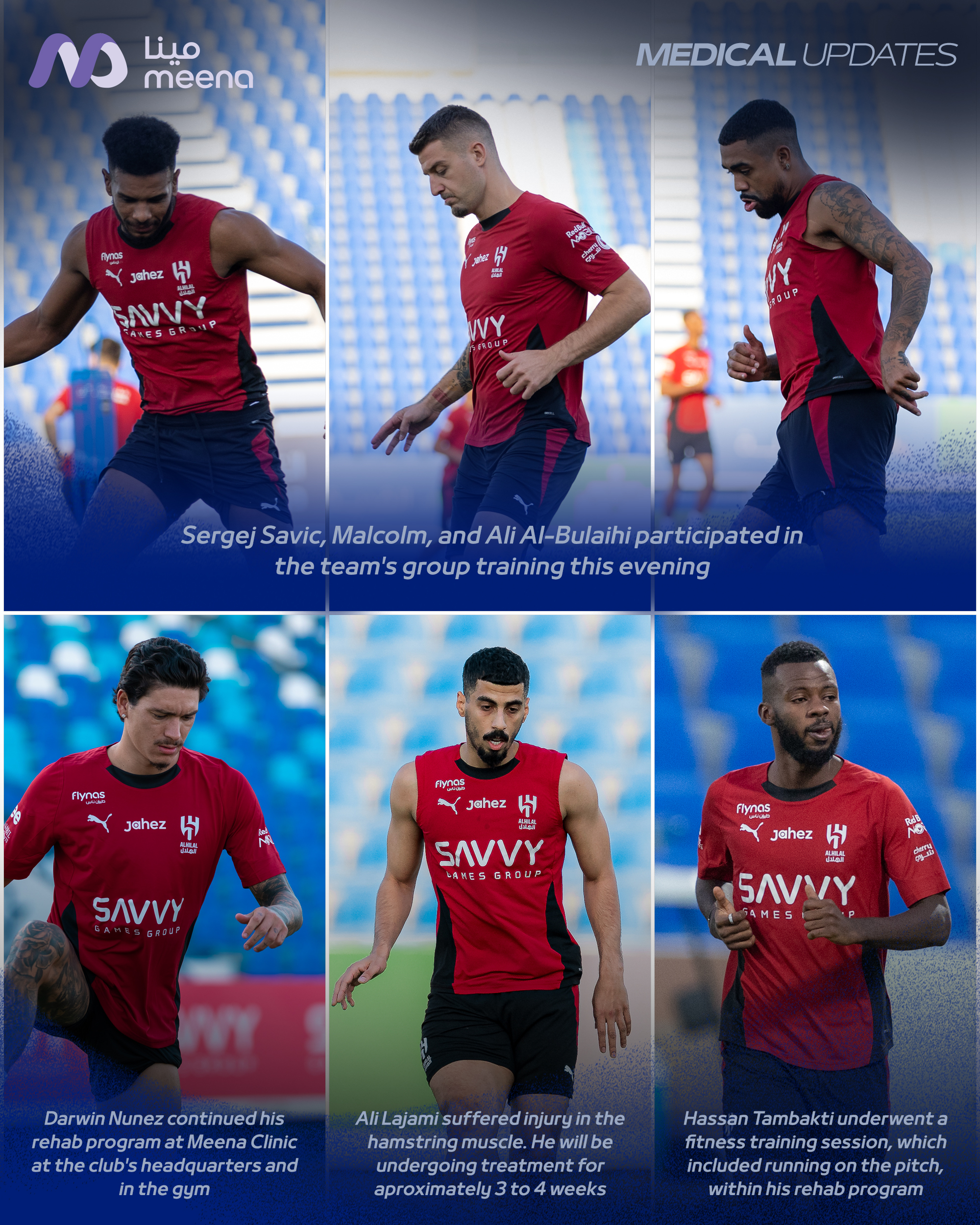 努涅斯仍在進行恢復健康練習,歸期未定;拉賈米在周中的亞冠中腿筋受傷將缺席三到四周時間;坦巴蒂進行了體能練習,歸期未定。