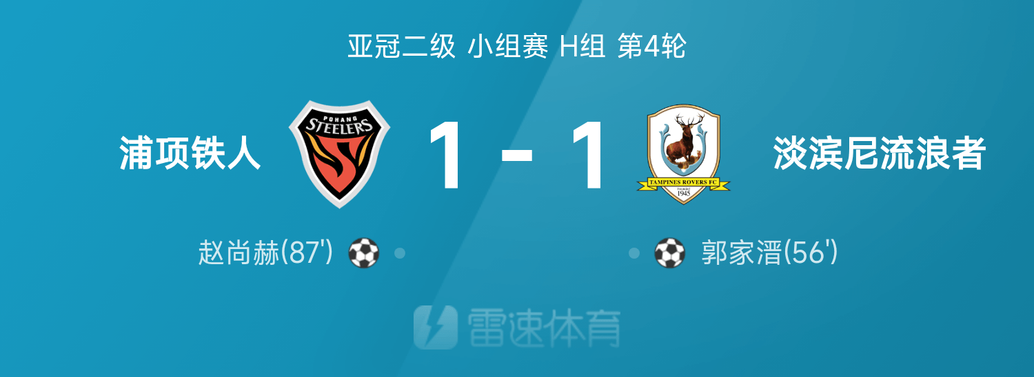 亞冠二級戰報:郭家溍破門,趙尚赫絕平,浦項1-1淡賓尼