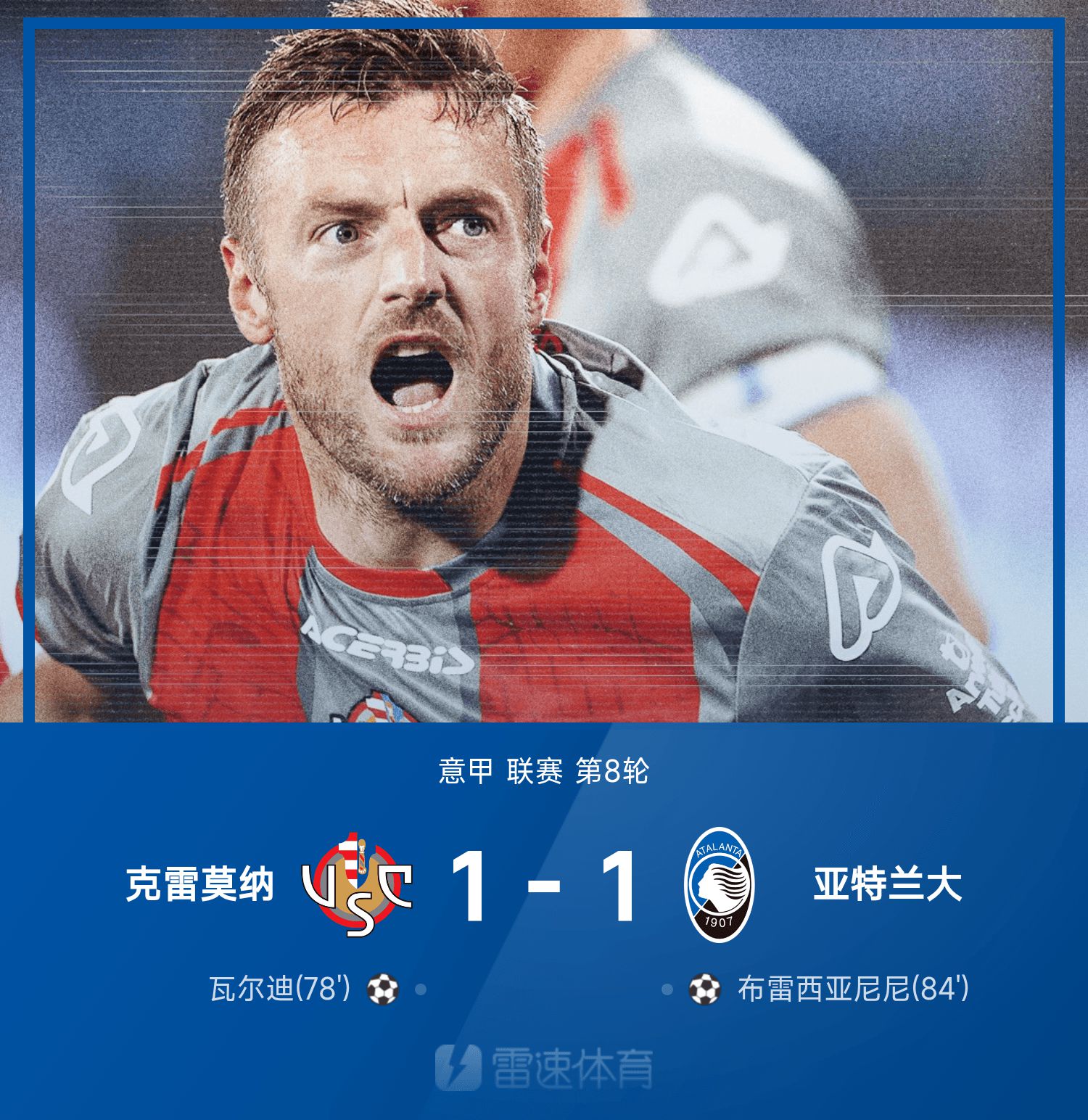 意甲戰報:瓦爾迪收穫意甲首球,克雷莫納1-1亞特蘭大