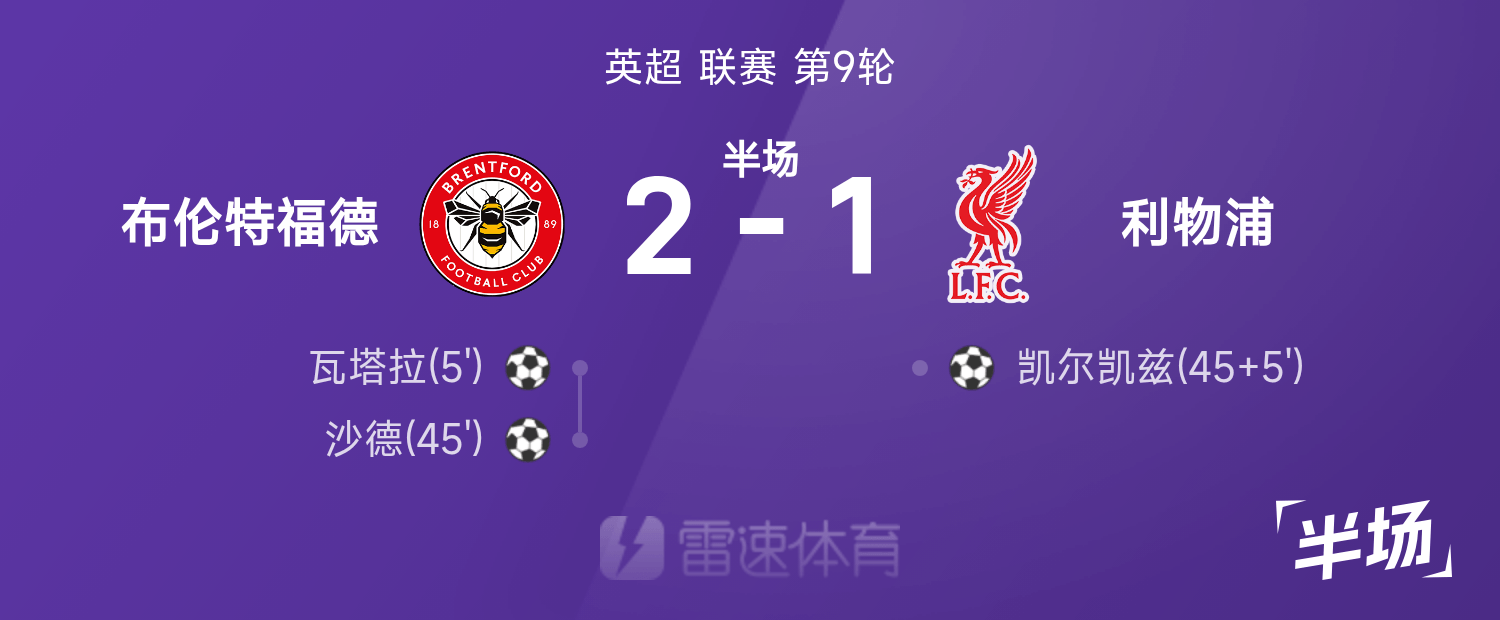 英超半場:瓦塔拉凌空側鉤破門,布倫特福德暫2-1利物浦