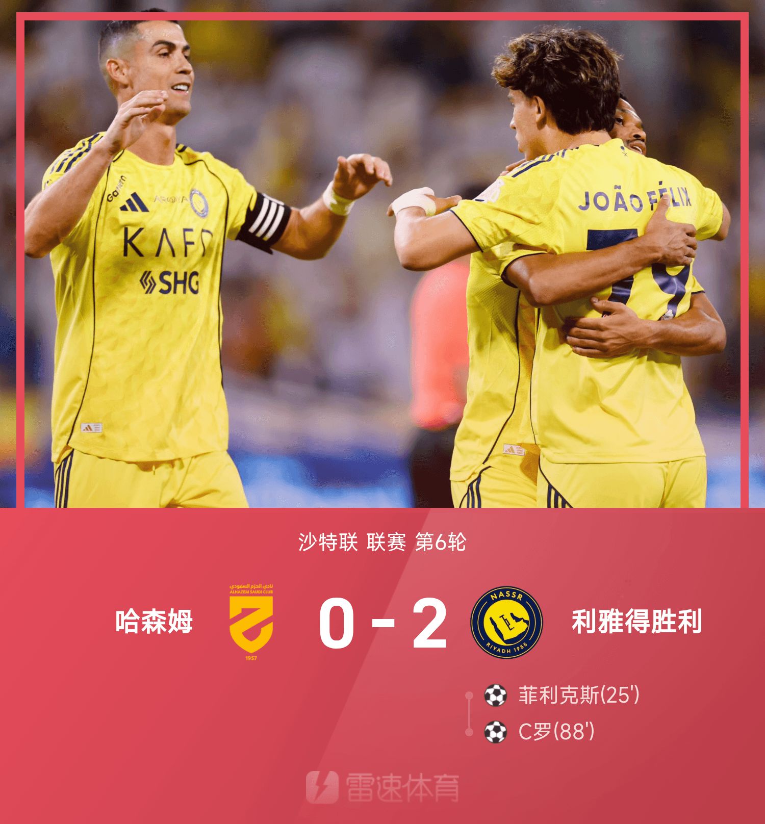 6686體育10月26日訊 25/26賽季沙特聯聯賽事第6輪,利雅得勝出局2-0擊敗哈森姆。上半場菲利克斯頂球破僵,下半場終結前,C羅吊射鎖定勝局。最終,利雅得勝出局客隊場2-0擊敗哈森姆,豪取聯賽6連勝。