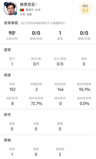 除了助攻,維蒂尼亞本場競賽多項數據都非常出彩。