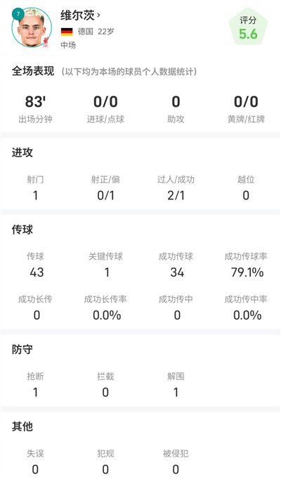 維爾茨全場數據:出賽83分鐘僅1次打門,2次過人1次勝利
